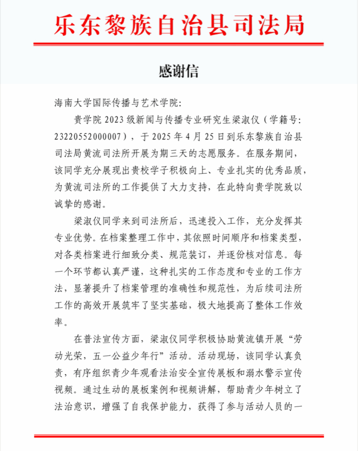 近日,乐东黎族自治县司法局向公司发来感谢信,对2023级新闻与传播专业研究生梁淑仪同学在黄流司法所开展的高质量志愿服务表示感谢。
